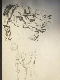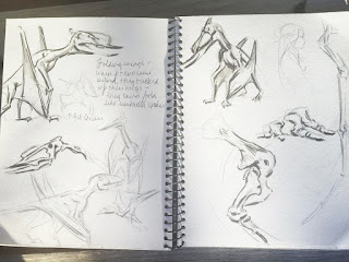 An excursion to the Natural History Museum in LA to see the Pterosaur exhibit. Since I draw dragons, this is an excellent opportunity to see how Pterosaurs flew. Unfortunately the exhibit was so dark, it was hard to sketch or see the detail better. I think they dim the lights so low that it makes it hard for photography~but makes it difficult for sketching as well. I was fascinated with the silohuettes of the bones~such interesting and terrific designs. Would be awesome to use a brush to paint these in~but museums are getting more strict in that most will not let you paint anymore near the exhibits. So I always bring my pencils and Faber Castell brushpens. These were sketched with a pencil that I thought is no longer made~Verithins (made by Berol, which is a Prismacolor pencil). Verithins are a smaller point, and not as fragile as the modern Prismas. They can take pressure and because of their point size, can handle finer details and more pressure then the Prismas. Prismas have a tendency to crumble, but the Verithins don't. We used to use some of them in Animation when 2D was still being done, but these days, I have to buy them online wherever I can find them. Recently, I just found out that the black Verithins are still being manufactured in Mexico. Just bought two boxes for the Sprites series I am working on. I just met up with my friend John Quinn of Disney Consumer Products and he gave me several boxes of them that were dumped at work. So now I don't have to buy online anymore! :) Thanks, John!!