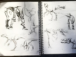 I started off with the Pterosaur exhibit first, then proceeded to my favorite section~the Age of Mammals. It blows my mind to think that many of these large animals lived here~right in California~and that we had the American Lion, which was a third bigger then the African Lion. I drew a lot that day, and my brain was fried by the time I got to the Lions. Check out the progression of skill: Pterosaurs, roughly drawn in semi darkness, had lunch, blood sugar went up, here I get the cleanest drawings in the Dinosaur Hall, then my brain gets tired and the two last pages, the sketches get looser. I've got eye and brain fatigue.